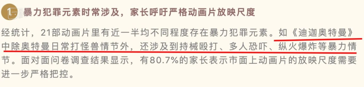 根据江苏消保委的统计,21部动画里,有近一半的作品存在暴力犯罪元素。在该报告中,他们所举的例子是“《迪迦奥特曼》日常打怪兽”。