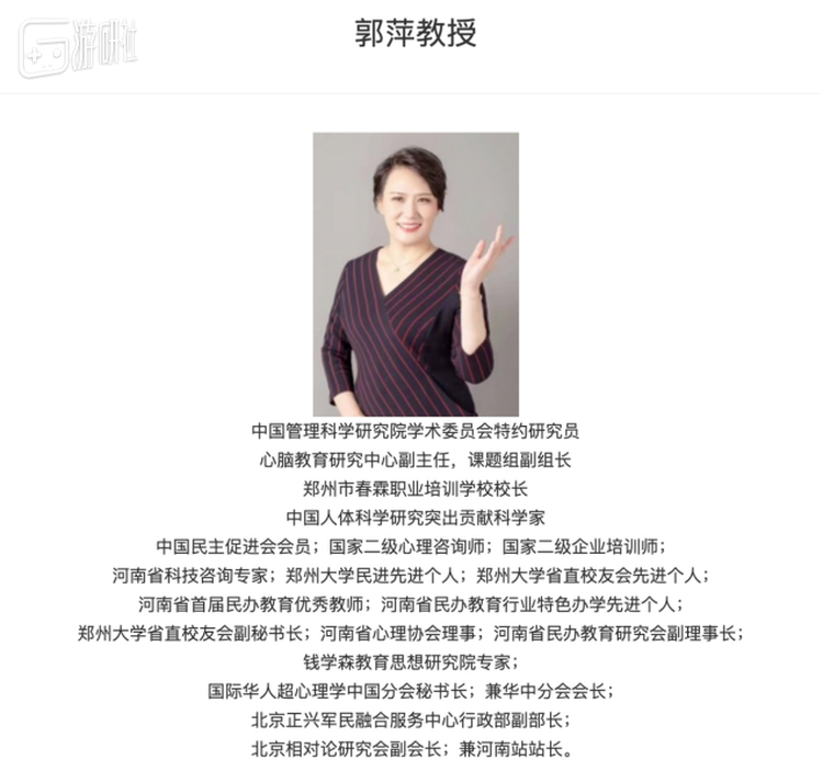 而作为第一作者的郭平,又名郭萍,是该校的校长。在网络上搜索她的信息,可以发现她有非常奢华的个人头衔和挂名。从心脑教育,到人体科学,再到钱学森研究和相对论研究,无所不包,让微商讲师都相形见绌: