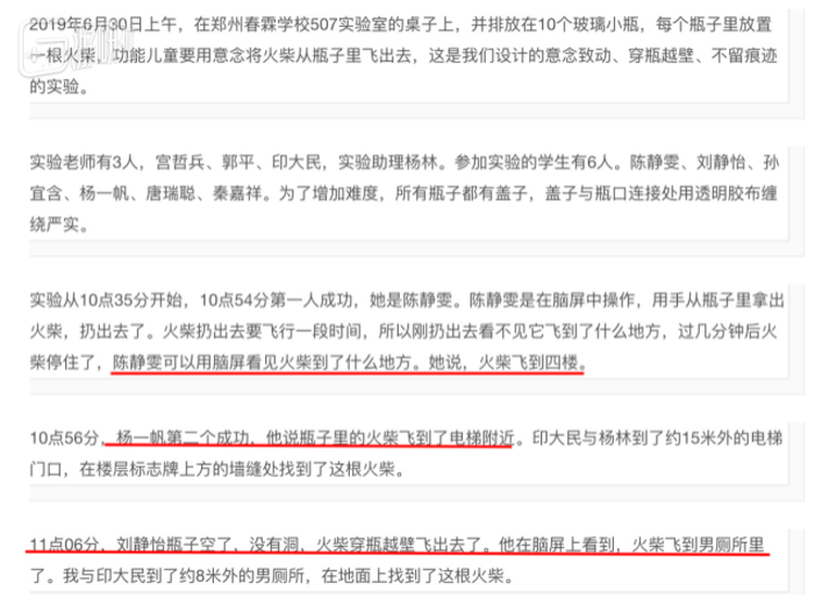 还有在《物体穿瓶越壁的实验与思考》中,学生用意念放飞瓶中火柴的景象也描绘的神乎其神。