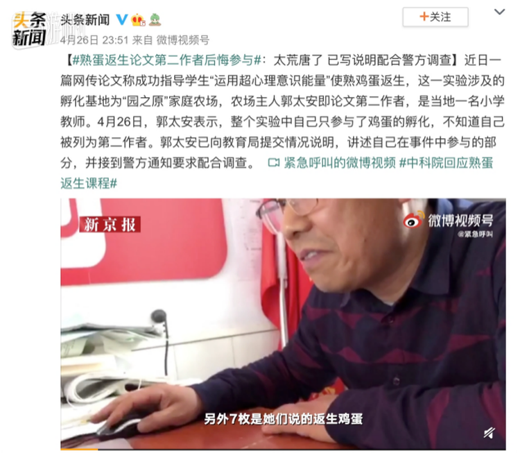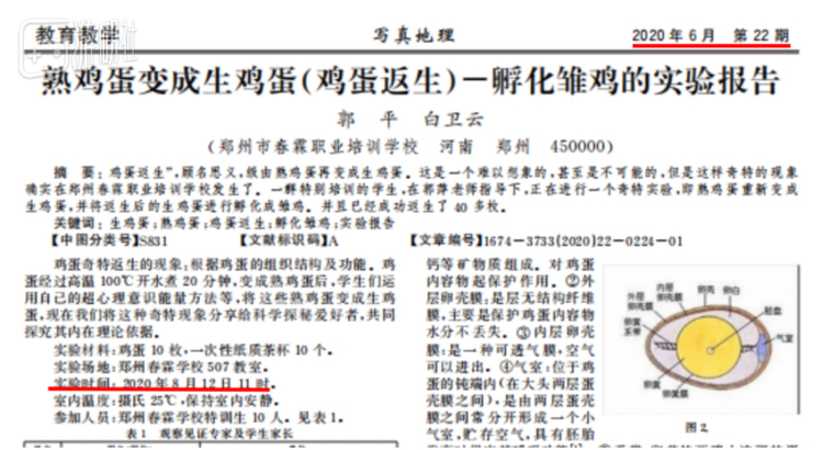 其中的主要原因是它的内容过于离谱:在这篇论文中,几位学生通过几个简单的操作,把熟鸡蛋变回了生鸡蛋。不仅如此,还用“复生”后的鸡蛋,孵出了小鸡。
