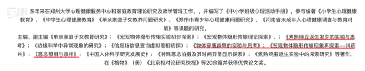 在此之前,她还著有《煮熟绿豆返生发芽的实验与思考》《物体穿瓶越壁的实验与思考》《宏观物体隐形传输现象再探索——抖药片》《意念照相与录相》《特殊意念拍摄及其时间异常显示探索》等经典大作。