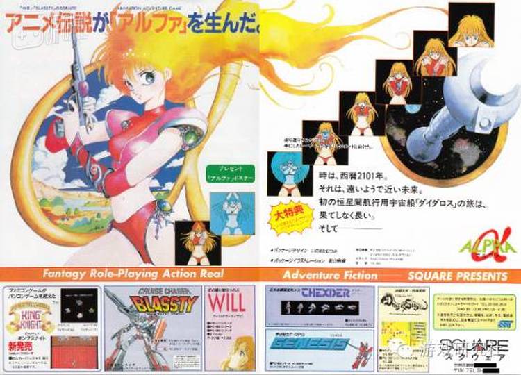 1986年公司出品的《ALPHA》(アルファ),是个科幻题材的指令式冒险游戏,为与其他公司区别特地使用了动画形式包装。游戏有两点值得称道:一是日后名声大噪的植松伸夫担当配乐,二是主人公在牢狱中有个全裸镜头。