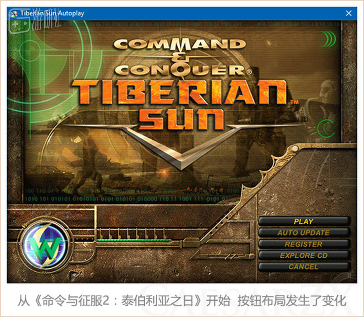 从这一代开始,Westwood的Autorun按钮进入垂直布局时代!(并没什么好兴奋的)5个按钮分别为“运行”、“自动升级”、“注册”、“浏览CD”和“取消”。几个无关痛痒的多余按钮实在令人惋惜。