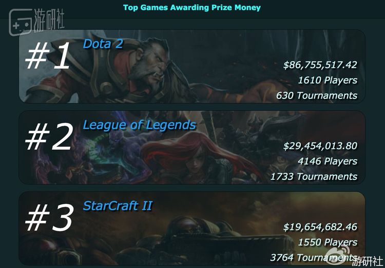 在TI6之后,在esportsearing的赛事奖金榜上,《DOTA2》也继续以累计8676万美元的总金额继续拉开了与其他游戏之间的差距,排在第二的《英雄联盟》各项赛事总奖金迄今累计为2945万美元,排在第三位的《星际争霸2》累计则为1965万美元。