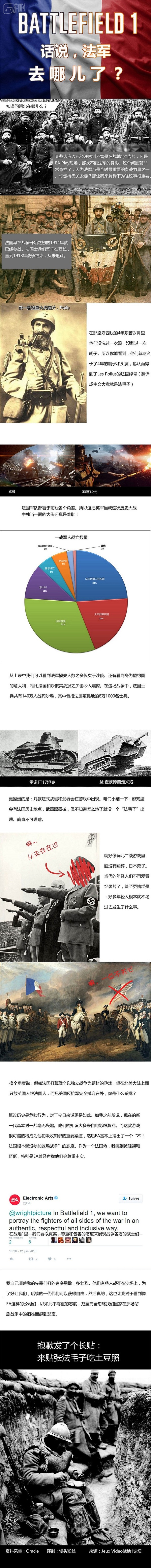 这位网友吐槽说,《战地1》多人战役里没有法俄,就像二战游戏当中没有德日一样可笑。由于一战离现在年代久远,而现在的年轻人大多对一战毫无兴趣,也不会和以前的人一样去查阅资料,他们的历史知识大多来自游戏和电影,显然会从《战地1》当中获取到错误的历史观。特别是,之前EA表示在《战地1》当中将以真实、尊重和包容的态度来展现战争各方。