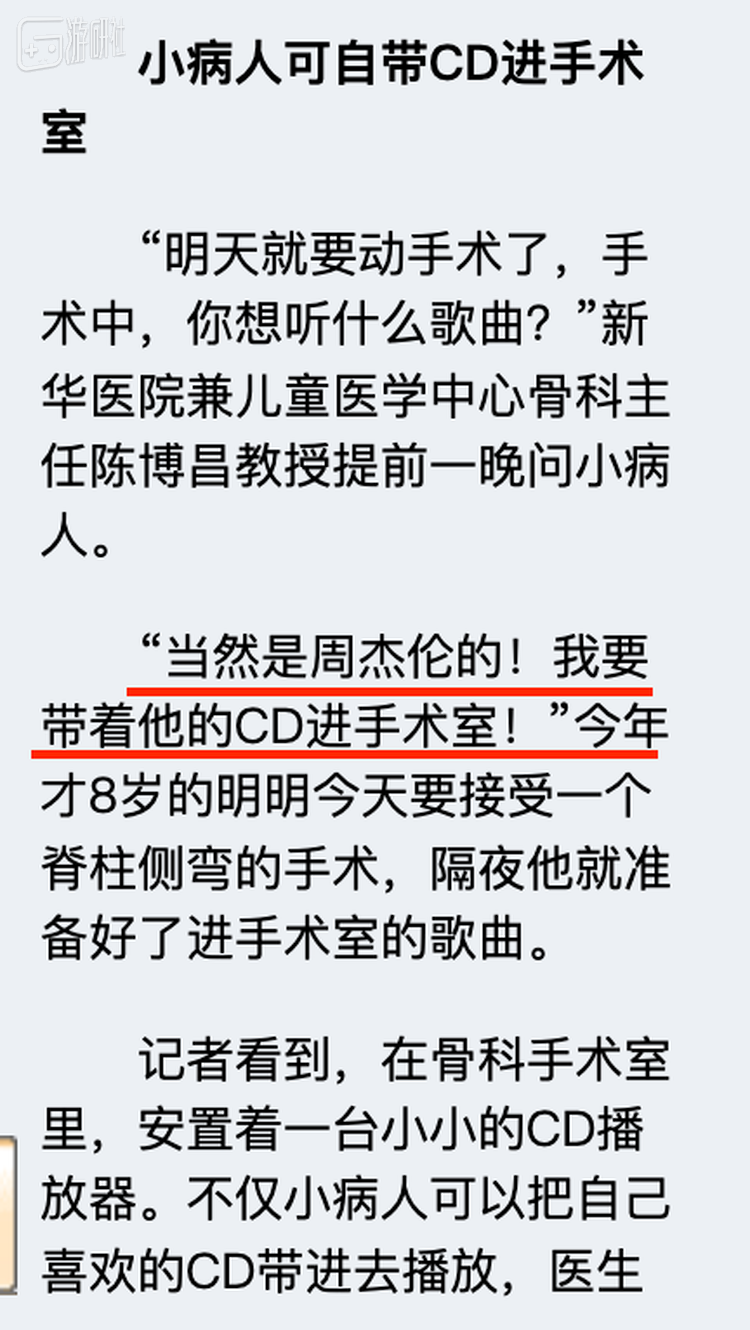 早在2005年,听歌不像如今这样方便的时候,就有这样的新闻:年仅八岁的小患者自己带了周杰伦的CD,好让自己有勇气接受手术。