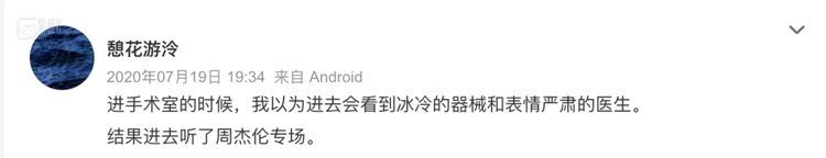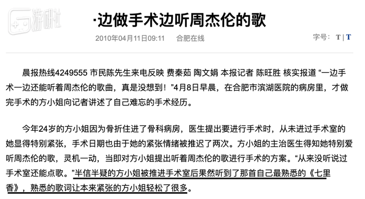早在十多年前,大家还不清楚“做手术还能听歌”的时候,“做手术听周杰伦”的现象就开始出现:一位骨折的女士因为听上《七里香》才敢踏进手术室。