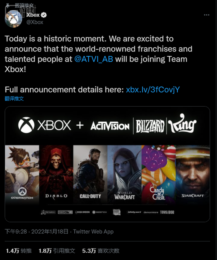 同时,这也是整个游戏行业有史以来最大金额的收购案—— 这个纪录原本属于一周前的 Take-Two(R星母公司 ) ,后者刚在1月10日宣布将以127亿美元价格收购Zynga的,如今这个数字被刷新了近六倍。