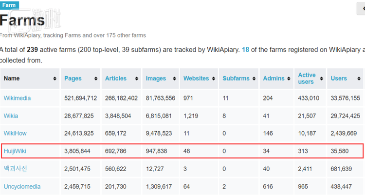 在WikiApiary收录的全球活跃Wiki农场名录中,灰机Wiki凭借380万页面数和70万条目数位列第四,但注册用户和活跃用户数都远远低于相应水平。