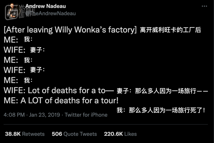 他还写了另一个段子,吐槽了《威利旺卡的巧克力工厂》:
