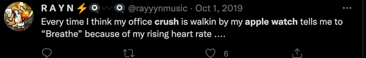 “每次我的暗恋对象路过的时候我的Apple watch都会提醒我‘深呼吸’,因为我的心率在升高……”