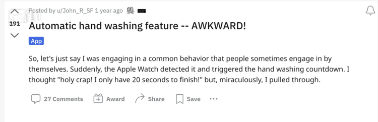 “当我在做一种‘私人运动’的时候。我的Apple Watch突然提示我触发了洗手倒计时,显示您还需要洗20秒。当时我就想,天呐,来不及了。但奇迹发生,我做到了!”