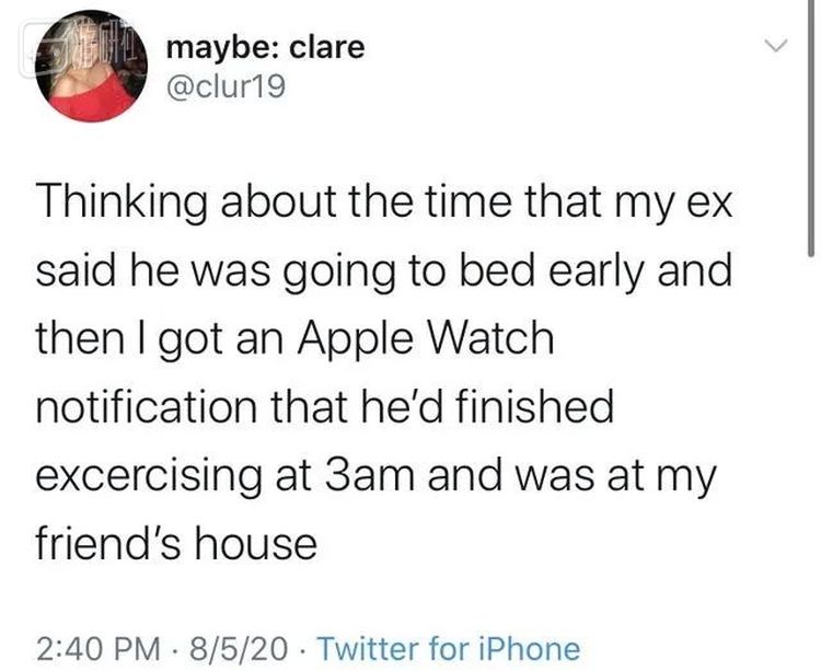 “想起那次我前男友说要早点睡觉,结果Apple Watch却提示他在我朋友家于夜里三点’完成了运动‘。”