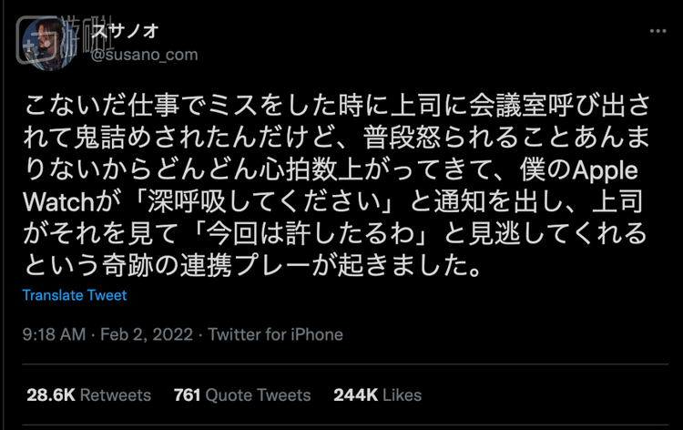 “前几天因为工作失误的事情被上司叫去会议室,结果被吓呆了。我平时很少被批评,所以心跳不断加快,我的手表发出了“请深呼吸”的通知,上司看到之后就说“这次我就原谅你了”……于是就这么放过我了”。