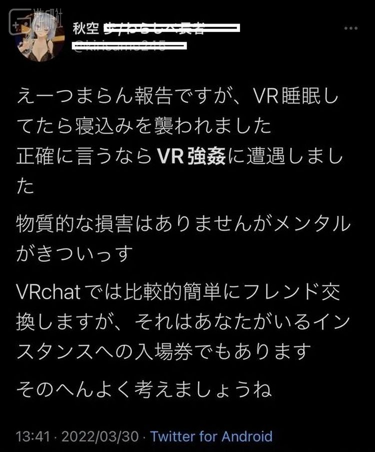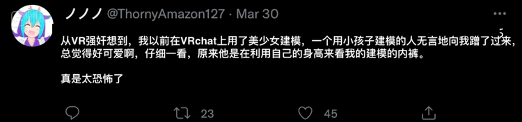 而就在前几天,一位名为秋空的《Vrchat》玩家则发文表示,自己在这款游戏里遭遇了性侵害: