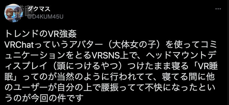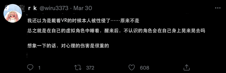“解释一下热搜的VR强奸话题吧。在VRchat这种用虚拟形象(多数是女性)进行社交的游戏里,戴着头显睡觉就是‘VR睡眠’。而在睡觉的时候,被其他玩家坐在身上摆动腰部,就是这次的(强奸)事件。”