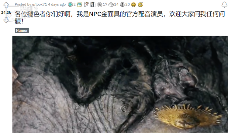 而近期的热门游戏《艾尔登法环》在前些天似乎也迎来了一场大型AMA活动,一位名为loox71的用户称自己为“金面具的官方配音演员”,并愿意回答玩家提出的任何问题。