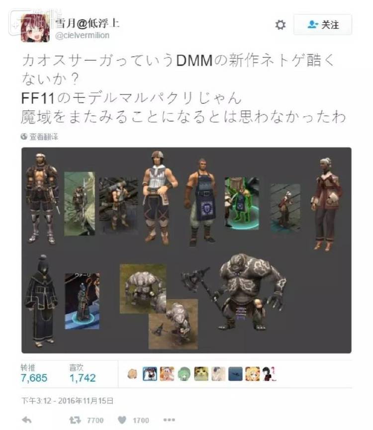 推文大意是:《Chaos Saga》这DMM的新游戏也太过分了吧?这不是完全照抄《最终幻想11》么。真没想到又能遇见像《魔域》这样的事情。