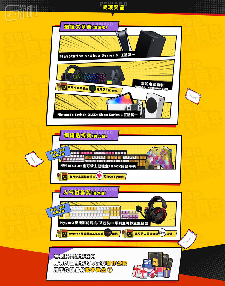 入围文章数量也不设上限,只要入围,都将获得创作点数,该点数可用来兑换各种数字礼物(包含Steam充值卡、京东礼品卡等),这意味着所有参赛入围文章都将获得创作收益。