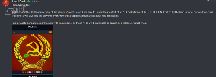 Polium官方开通的Discord频道内也相当活跃。不过,相比和官方一起畅想Web3.0和区块链的美好未来,大部分网友似乎是冲着捣乱的心态去的,除了刷屏捣乱的色图,最引人注目的只有”斯大林同志”声称要与Polium合作上架工人群体NFT图片的消息。