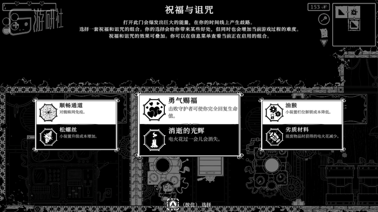 击败敌人会掉落的“电火花”是游戏中唯一的“货币”,回复血量、在商店购买物品、升级装备都需要用到。由于每经过一个区域时,游戏会同时给予你两个正反面的buff,是尽早花钱升满所有装备栏,还是攒钱买到更稳定的搭配装才是难题。