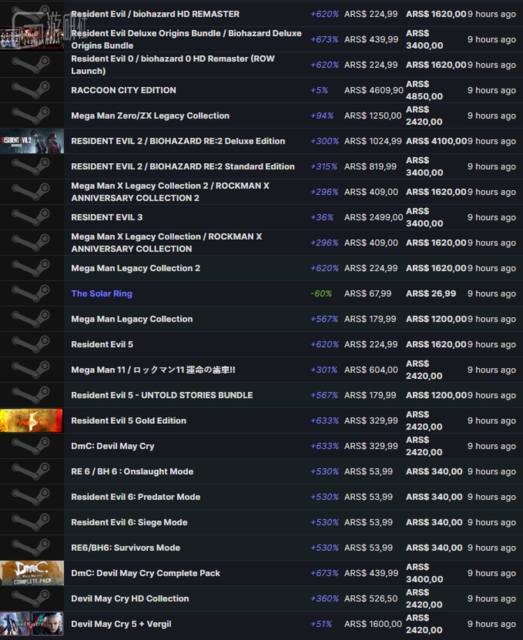 4. 卡普空旗下游戏在多个Steam低价区涨价,其中包括土耳其区、阿根廷区、巴西区、智利区等。阿根廷区部分游戏的价格涨幅高达600%。不久前,《艾尔登法环》也宣布提高在阿根廷区的售价,现价已经高于国区。