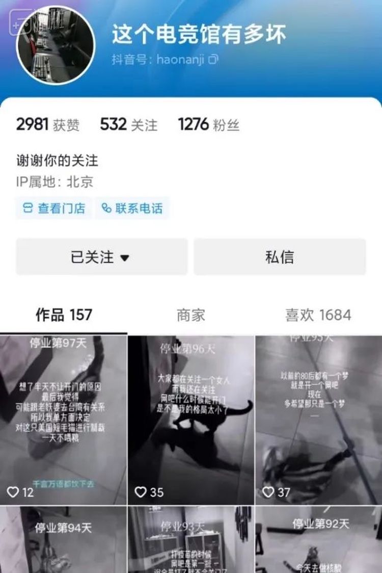 星逸电竞馆是五环外一家开业刚超过两年的年轻网吧。他家从去年8月份起就开始在抖音上发布“停业日记”,每一条视频里都是空无一人的大厅,唯二的活物只有拍摄者和一只猫。