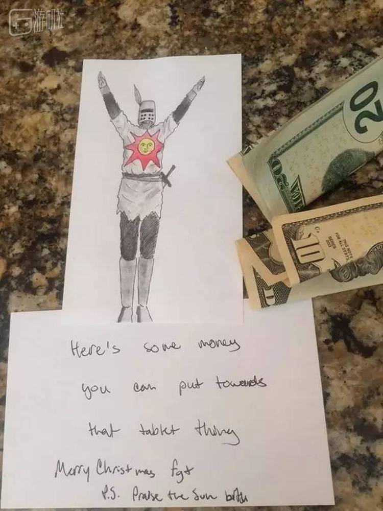 “拿着这些钱去买点喜欢的东西吧,圣诞快乐,PS:赞美太阳!”(黑暗之魂)