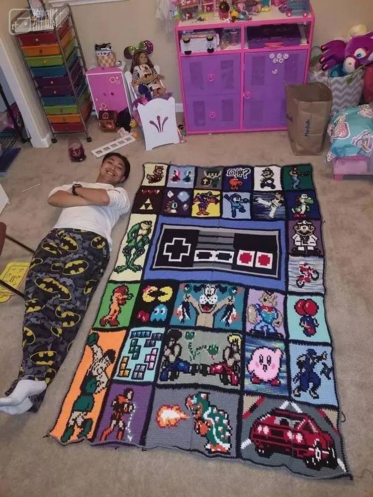 “老婆送我的圣诞礼物!一张绣满复古游戏的毯子!”