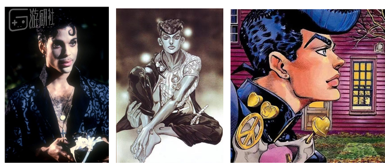 令摇滚发烧友狂喜的第四部《不灭钻石》可谓《JOJO》融合潮流史的典范之一。作为荒木最喜欢的歌手之一,普林斯(Prince,美国流行歌手、词曲作家、音乐家、演员,以全面的音乐才能和华丽的服装及舞台表演著称)不仅为他提供了东方仗助发型「牛排头」的灵感来源,更贡献了专辑名称「The Gold Experience」,成为第五部主角乔鲁诺的替身名。而仗助胸前醒目的「Peace & Love」标志则暗示了嬉皮士精神和朋克文化在《JOJO》中的重要地位:The Beatles、Queen、Sex Pistols、Pink Floyd、David Bowie、The Rolling Stone……就连大乔的伙伴齐贝林,其姓氏都来自著名的英国摇滚乐队Led Zeppelin(齐柏林飞艇)。