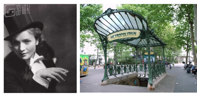 此处仅以桑塔格所列举的「坎普」气质代表为例,左图为女演员玛琳·迪特里希(Marlene Dietrich),右图为受「新艺术运动」影响而设计成铁铸兰花柄形状的巴黎地铁入口由此,一条不算复杂的线索映入眼帘:JOJO们的形象似乎呈现了某种性别观念上的尝试,从传统的男女二元设计到走向五彩斑斓的泛性化主角,并且在饱满的色彩和丰沛的人物情感加持下充满性张力。这与世纪之交逐渐开放的文化环境密不可分,也与荒木本人不断成熟的审美观息息相关。