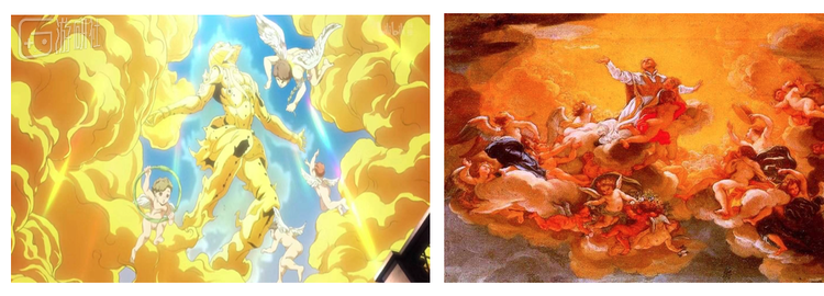 显然,《JOJO》的TV动画制作团队也继承了荒木的基本理念。我们由此可以在《不灭钻石》中看到黄色的天空和紫色调的背景,《黄金之风》中夺目的金色云彩和紫色火焰,以及徐伦和狱中姐妹各式各样的口绿、口紫、口蓝和口黑唇色。