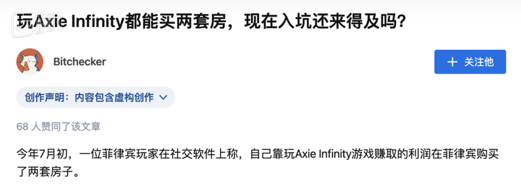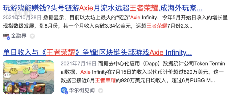 故事的主角《Axie Infinity》是个非同一般的作品,它是去年至今世界范围内讨论热度最高的游戏之一。在国内,当你搜索“axie”时,也总能看到一些令人惊讶的言论:“流水碾压王者荣耀”、“当今世界最赚钱的游戏”、“玩这游戏买两套房了”.....