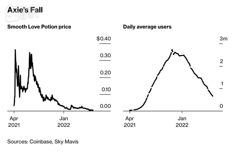 自今年2月起,越来越多有关axie经济下行躁动的声音传来,市场在一两周内迅速产生了反应。原本长久维持超高价格的精灵应声而跌,接着有人大量抛售溃逃,SLP等货币价格也随之一泻千里。