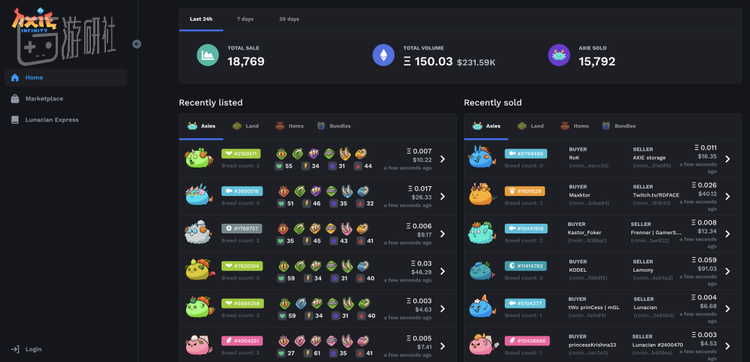 axie公司虽也是生产者,但同时它将自己的产品完全开放,玩家入门前提的三只精灵,不由游戏公司提供而是向其他玩家购买。他们会从玩家每一笔交易中抽取4.25%作为佣金,当玩家交易市场愈发热烈,对应的游戏公司营收也就越高。