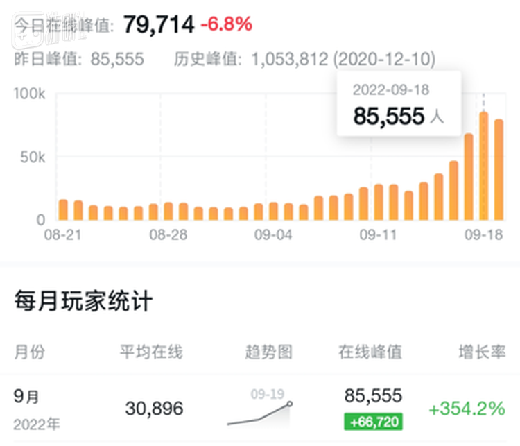 人气的低迷与多方因素有关,单机游戏的热度下滑也是不可避免的命运。不过在上周,一切都有了转机——自9月13日以来,《赛博朋克2077》的在线人数一路爬升,并在上周日实现了85555人同时在线,创下了游戏首发期之后的最高纪录。