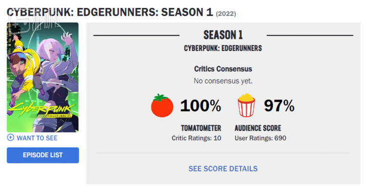 《赛博浪客》是由动画公司扳机社负责制作,由网飞担任宣发的网络动画。考虑到扳机社、网飞以及CDPR近年来作品的舆论情况,这部以《赛博朋克2077》为原型的作品在开播之前普遍不被看好,但在9月13日正式放送后,凭借着对游戏设定的深度考据,对夜之城场景的完美还原,对主要角色的用心刻画,以及还算不错的剧本叙事,《赛博浪客》成功问鼎各大评分网站,颇有拿下年度最佳动画桂冠的势头。