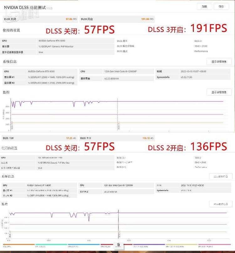 整体看下来,DLSS 3比起上一代DLSS在帧数上的提升很大。我们在完全相同的测试环境下,用3DMark的测试工具对比了二者之间的区别,帧数成绩分别为191和136。