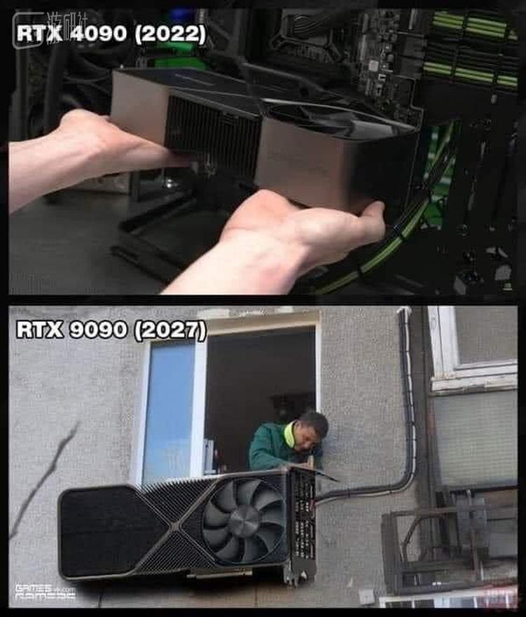 当然这随之而来的,还有公版RTX 4090肉眼可见巨大的体积。整张卡的厚度和长度都大了一圈,320毫米左右的总长度对于一些机箱的尺寸也是个挑战。重量虽然和RTX 3090相差不大,但依然是个重量级。在前几天它的外观解禁后,关于它的梗图已经诞生了不少,应该比我提到的这些数据更加直观。