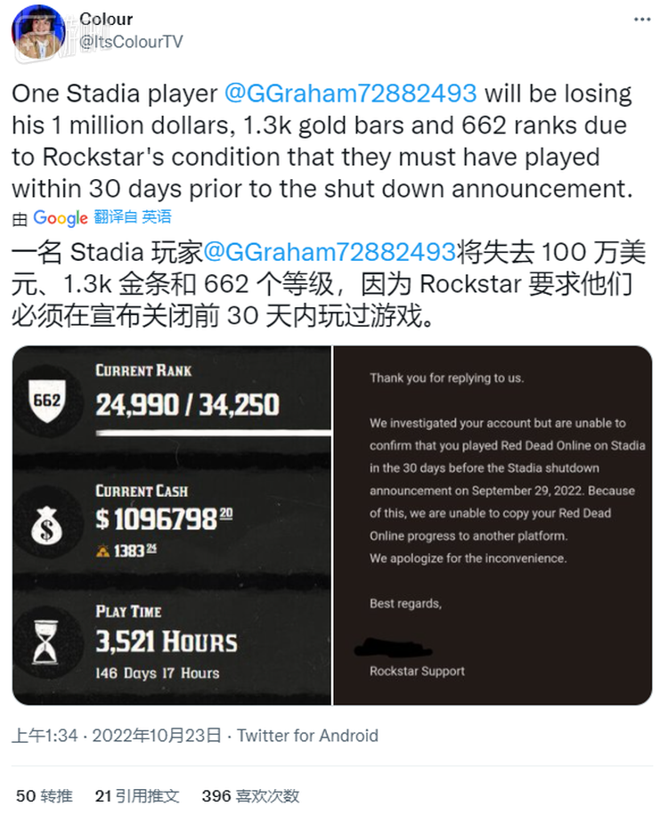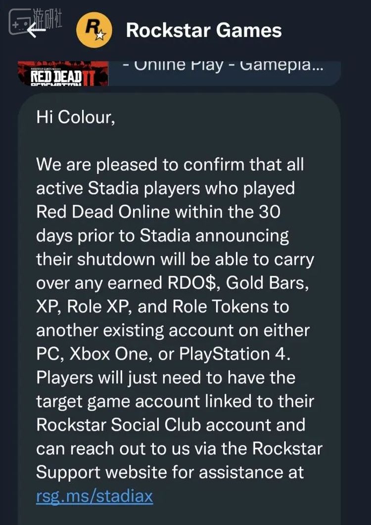 Colour给R星客服发了邮件,同时在推特上提出公开请求,希望R星能够发发善心,帮助Stadia上的所有RDO玩家转移存档。几家游戏媒体对Colour的遭遇进行了报道,他也一一予以转发。