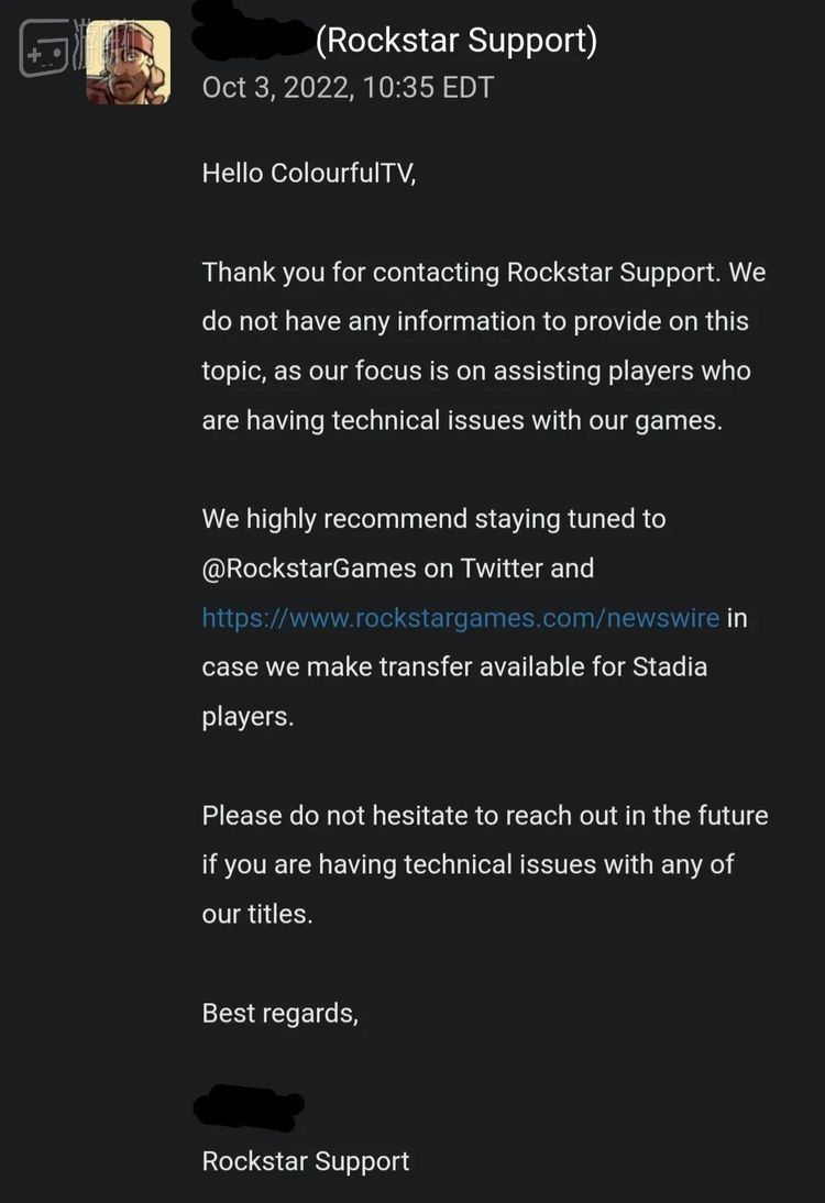 10月3日,Colour收到了R星客服的一条自动回复:“我们不会提供关于这个问题的任何信息,因为我们更注重于帮助那些在游戏中碰到技术问题的玩家。”
