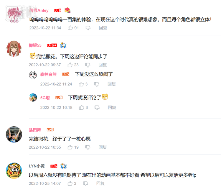 于是这部动画的B站评论区里形成了奇妙的景象:每周B站版更新的时候,观众却在评论区里讨论着其他地方观看的最新话,而当B站播放到90话的时候,大家已经开始完结撒花了。